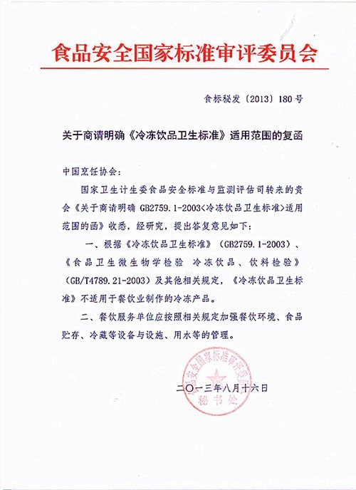 8月16日,食品安全国家标准审评委员会做出答复,其中明确表示:根据《冷冻饮品卫生标准》(GB2759.1-2003)、《食品卫生微生物学检验冷冻饮品、饮料检验》(GB/T4789.21-2003)及其他相关规定,《冷冻饮品卫生标准》不适用于餐饮业制作的冷冻产品。中国烹饪协会将该《复函》迅速转发给翘首期盼中的诸多餐饮企业,成功终止了各地的无序抽检与集中处罚。百胜、麦当劳等公司通过不同方式向协会表达感谢,认为冰块事件能这么快得到国家最高权威机构的答复,对行业而言具有里程碑式的意义,虽然是协会反映行业诉求众多行为中的一件,却代表着协会工作的新气象,真实践行了“走群众路线”的要求,开辟了行业危机处理的新思路、新方向。